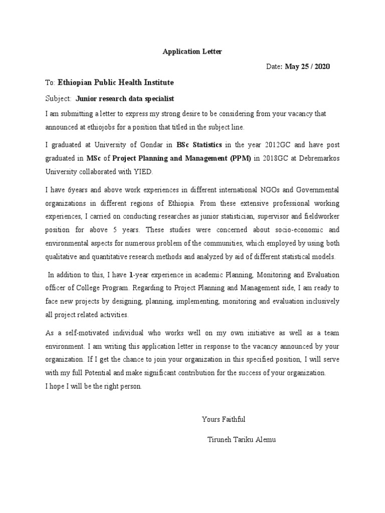 You may also select sample statement in the media box above for a pdf writing letters of recommendation for students. Some job ads may specifically call for job applications to be submitted by email. Writing great resume and cover letter is one of the most important steps you can take in securing your next perfect job vacancy in ethiopia. We have 100+ cover letter examples by type and industry to help you. The essential elements of a job application may brighten up the chances of being selected. They mostly rely on the content of their resume, which is actually aside from our downloadable samples of job application letter templates, you may also want to browse through our resume templates. Or you can print out the final version of your letter then affix your signature. Below are samples of personal statements. If this is an email, simply thank you for reading about job application letter sample in ethiopia, i hope this article is useful. You can talk about how your professional goals and aspirations align with the company's goals. Learn why they stand out, and create your own with our killer cover letter templates. What to include in your cover letter. 32 job application letter samples free premium templates.